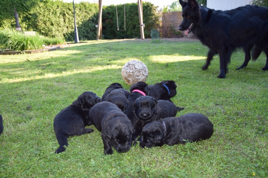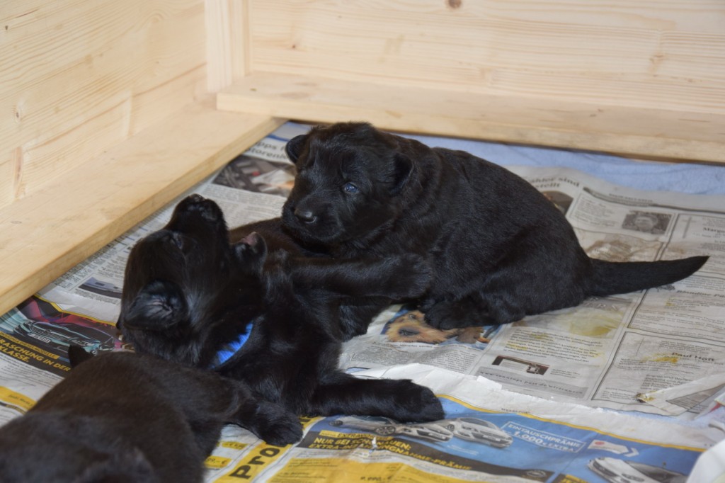 17.5. / Tag 17: Die Kleinen haben neue Halsbänder (breitere mit Klettverschluss) und fangen an sich miteinander zu beschäftigen… so in Ohren zwicken und sich gegenseitig umschmeißen…