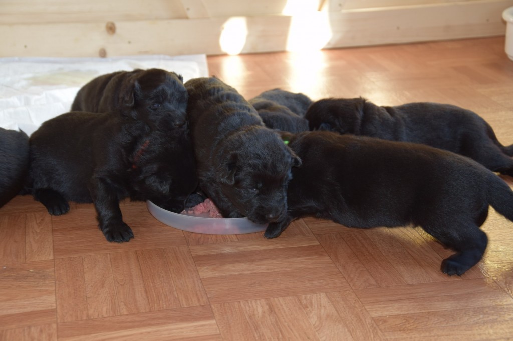16.5. / Tag 16: Die Welpchen werden immer größer und aktiver. Und die fangen an zu fressen! Hier probieren sie Rindertatar:
